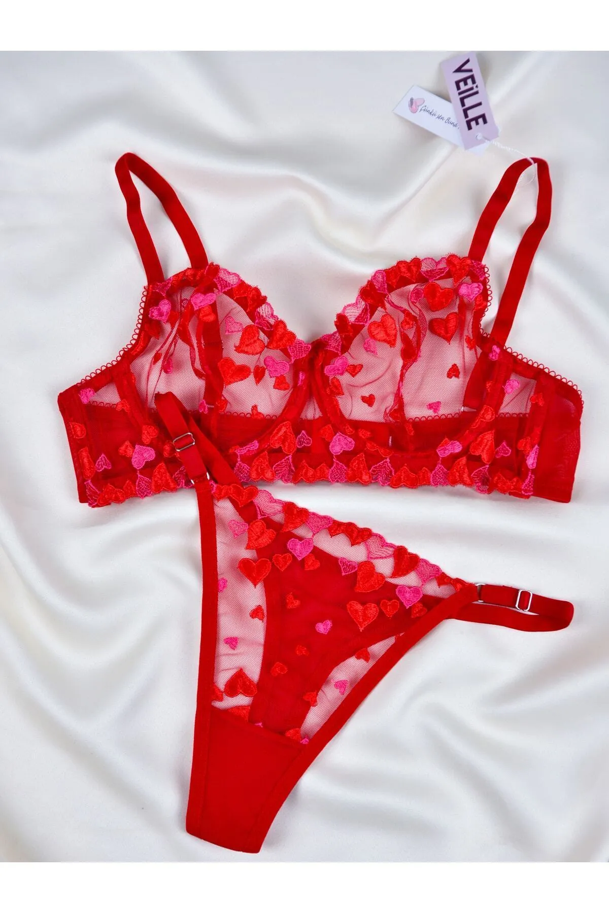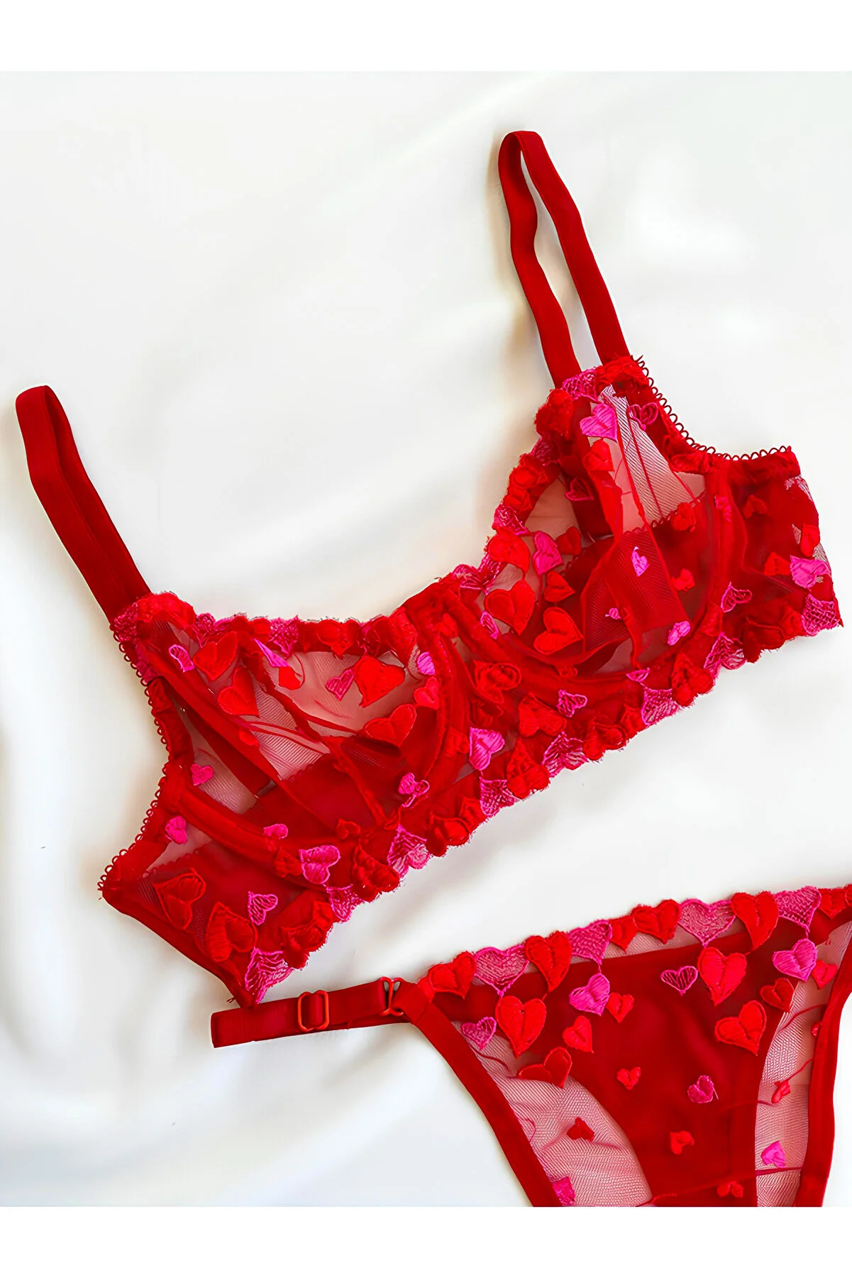Kadın Kalpli Kırmızı Dantelli Balenli Sütyen Külot Takım