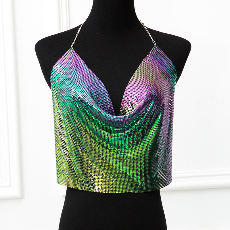 Parlak Gökuşağı Crop & Bluz Kolsuz Kayık Yaka Zırh Büstiyer